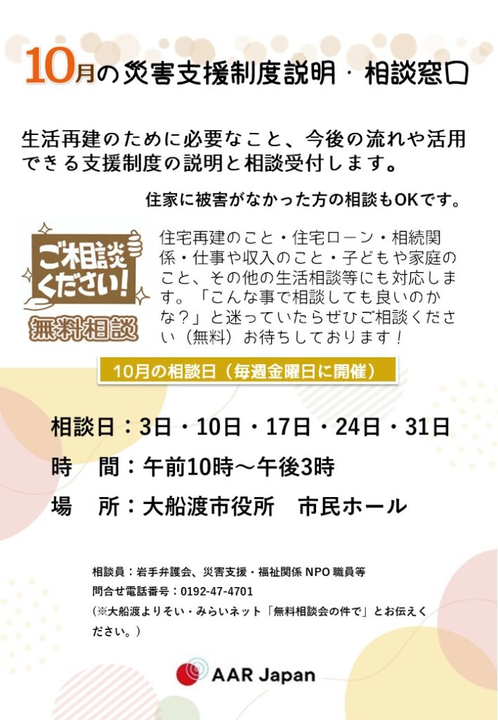 10月の「大船渡林野火災」相談窓口は大船渡市役所・市民ホールにて10月3日・10日・17日・24日・31日の金曜日(計5回)の午前10時~午後3時に開催します。